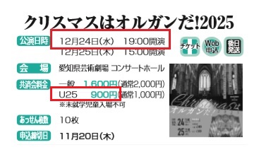 クリスマスはオルガンだ!2025 12/25(木)15:00<U25>【後日発送】