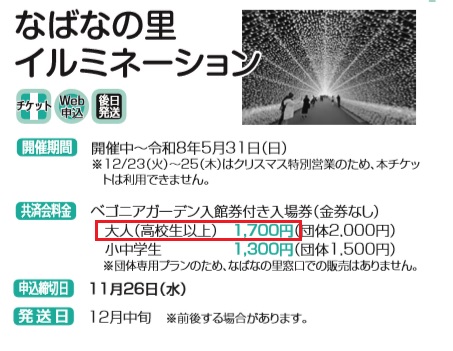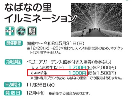 なばなの里イルミネーション ベゴニアガーデン入館券付き入場券〈小中学生〉【後日発送】