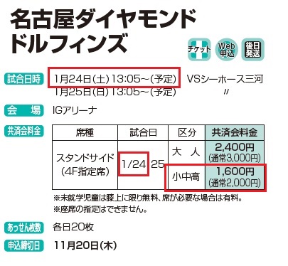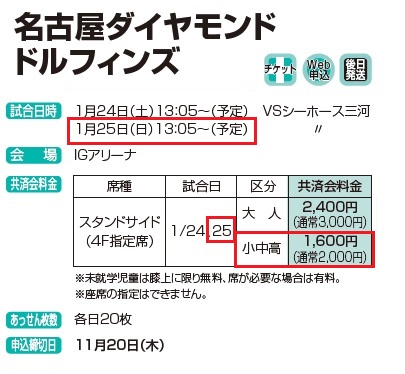 名古屋ダイヤモンドドルフィンズ 1/24(土)13:05~(予定) シーホース三河<小中高>【後日発送】