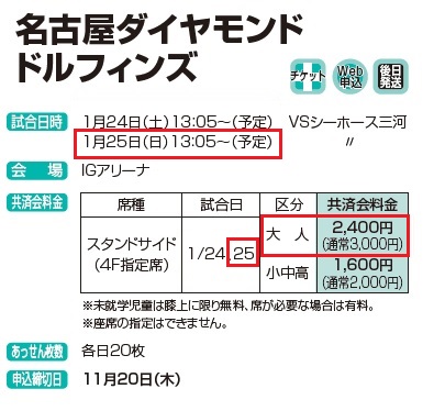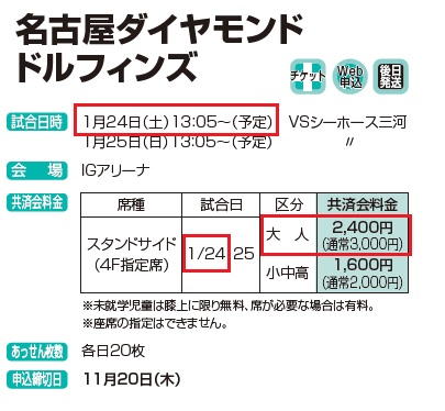 名古屋ダイヤモンドドルフィンズ 1/24(土)13:05~(予定) シーホース三河<大人>【後日発送】